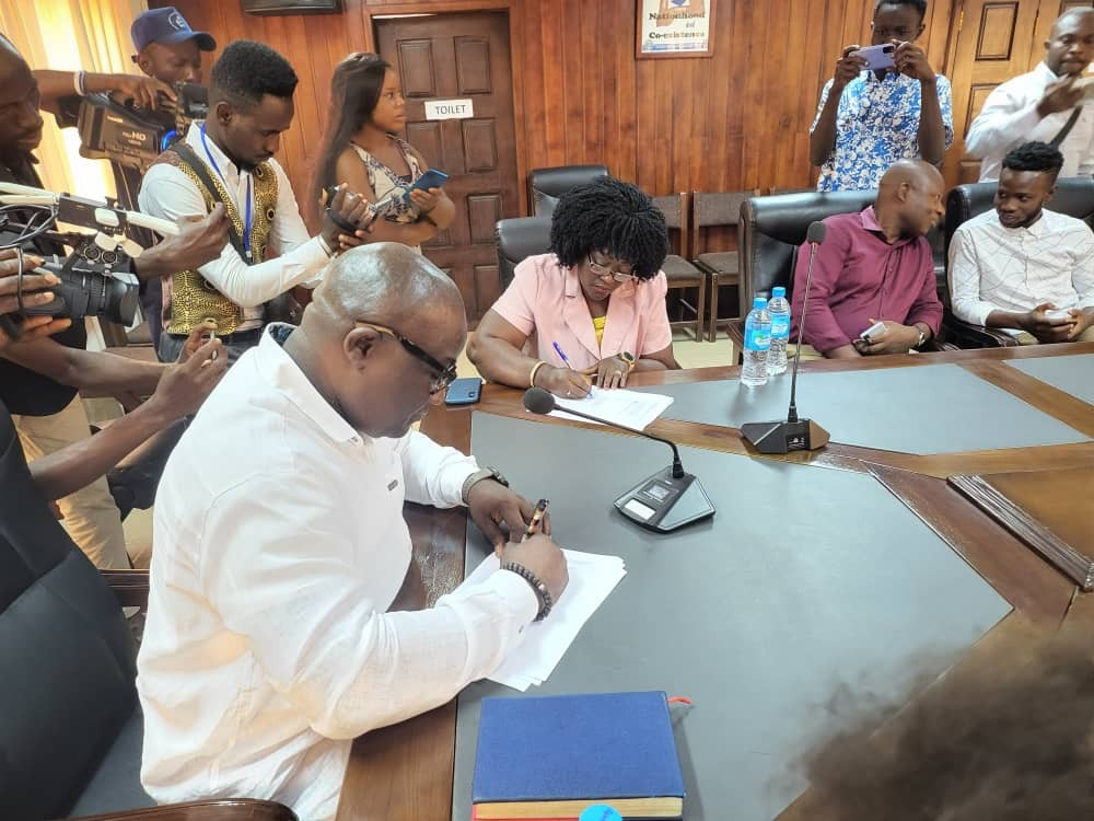 The signing of the MoU was done by the Chief Electoral Commissioner and Chairman of the Electoral Commission for Sierra Leone, Mohamed Kenewui Konneh, and the General Manager of AYV, Madam Tucker in the conference room of the ECSL.