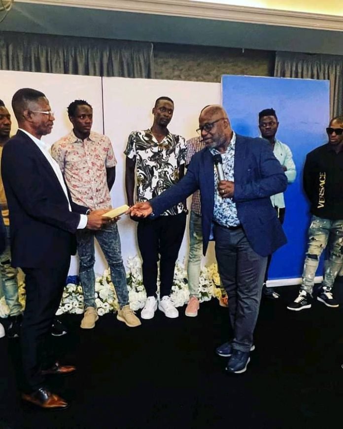 The former MD of the Sierra Leone Commercial Bank presents the money to the SLFA President Thomas Daddy Brima through the Minister of Sports Ibrahim Nylenkeh at the Lagaonda Complex during a thank-you dinner in honor of Leone Stars.