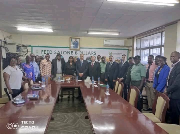 An Egyptian delegation, led by Sierra Leone’s Ambassador to Egypt, Mr. Sadiq Silla, paid a courtesy visit to the Ministry of Agriculture and Food Security (MAFS) at the Youyi Building in Freetown on Monday. The visit aimed to explore potential investment opportunities under the Feed Salone initiative and strengthen bilateral cooperation between the two nations.