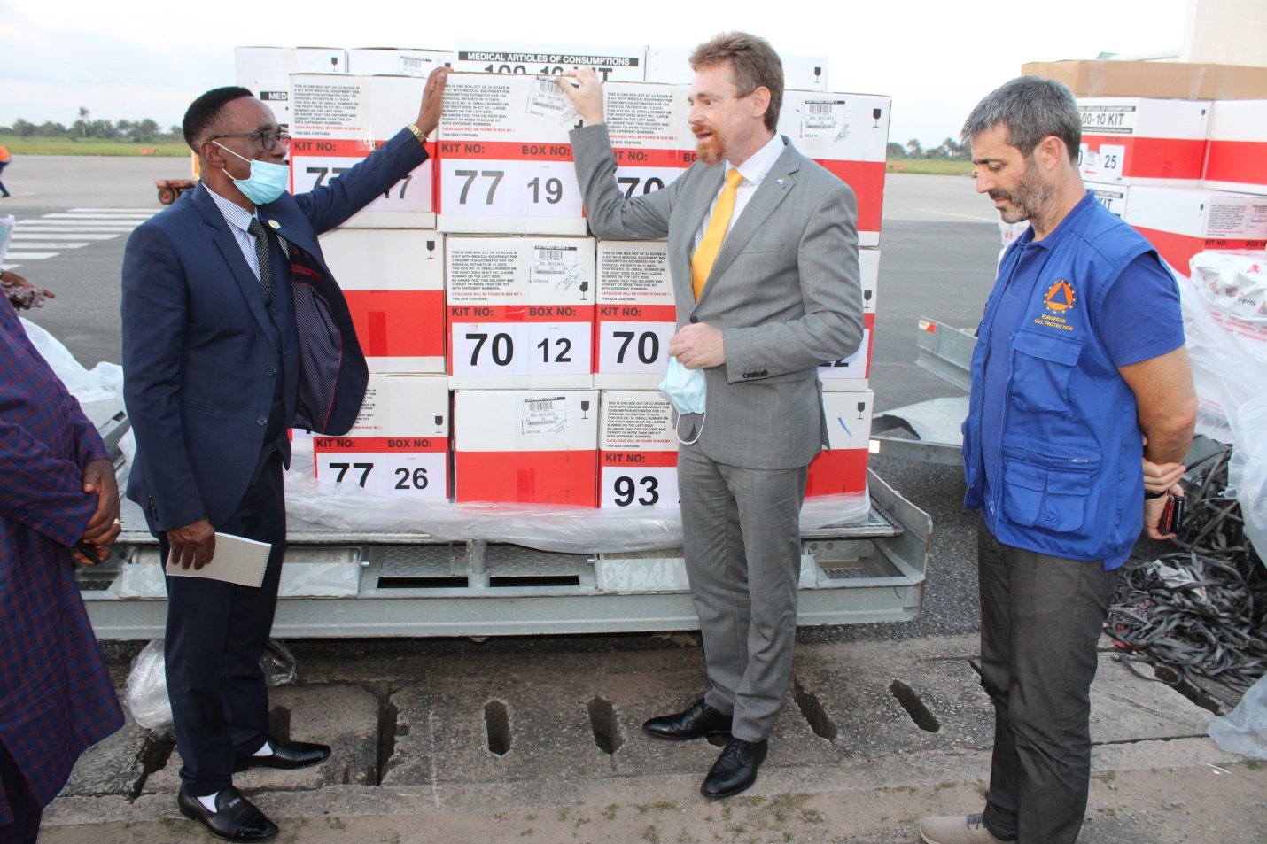 With support from the people of Norway, the European Union Ambassador Manuel Alexander Muller has on the 16th November 2021 at the Lungi International Airport, handed over one hundred and sixty-five (165) boxes of assorted surgical equipment to the Ministry of Health and Sanitation towards the fire victims.