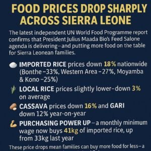 Sierra Leone is experiencing a noticeable decline in food prices, with significant drops in the cost of rice, cassava, and gari across the country. This is according to the latest Market Price Bulletin released by the United Nations World Food Programme (WFP), which attributes the positive trend to the impact of the government’s flagship Feed Salone initiative.