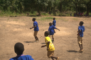 Children in Kawa 1 play together after school under the watch of their teacher.