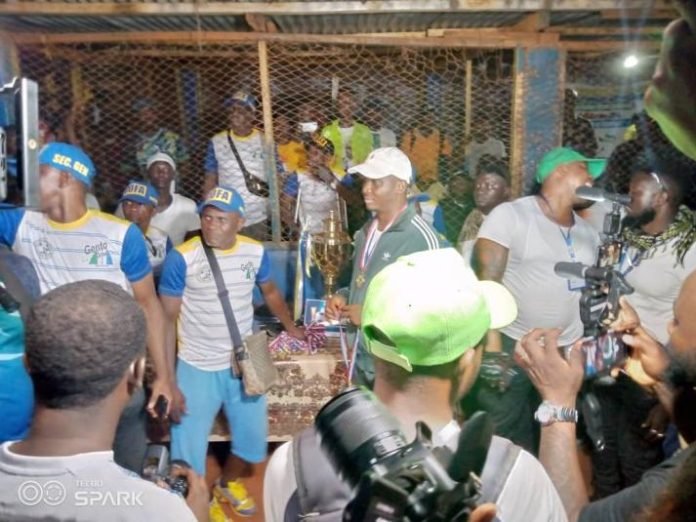 Kroo Town Road Community on 17th December 2022 lefts President Julius Maada Bio’s trophy in collaboration with Ahmed Gento’s group company as they defeated Summer City by post-game penalties at the Parade grounds.