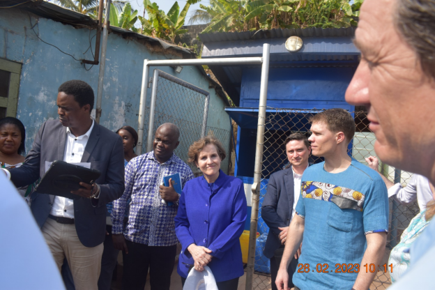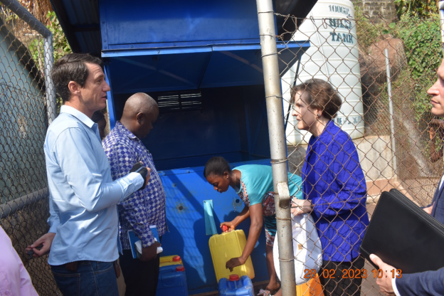 The Chief Executive Officer of the Millennium Challenge Corporation (MCC), Alice Albright has on Tuesday 28th February, 2023 visited one of the Guma Valley Water Company water kiosks at Spain Area, Kroo Bay that was constructed under the MCC funded Threshold Program that ended in March 2021.