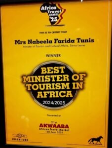 In a landmark moment for Sierra Leone, Mrs. Nabeela Farida Tunis, the country’s Minister of Tourism and Cultural Affairs, has been crowned Best Minister of Tourism in Africa at the 21st AKWAABA African Travel Market.