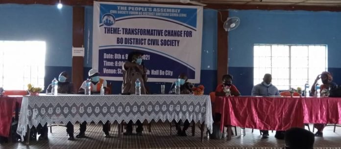Mr. Kamara made this statement at the opening ceremony of the People’s Assembly organized by the Bo District Civil Society Youth Forum on the theme Transformative Change for Bo District Civil Society, which took place at the Saint Francis Parish Hall in Bo on Thursday, 8 July 2021.