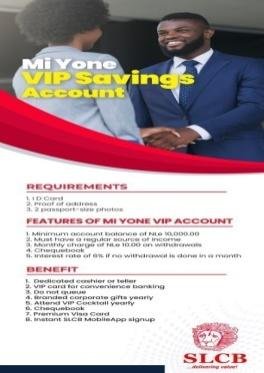 For Mi Yone VIP Savings Account, Mr. Silla said the requirements needed are an ID card, proof of address, and passport-size photos, adding that its features are a minimum account balance of Le 10,000.00 and a regular source of income, a monthly charge of Le10.00 on withdrawals, checkbook issued, and an interest rate of 6 percent if no withdrawal is done in a month. Its benefits are a dedicated cashier or teller, VIP Card for convenient banking without going to the queue, yearly branded corporate gifts, attendance to a yearly VIP Cocktail, a checkbook, a premium visa card, and an instant SLCB Mobile App sign-up.